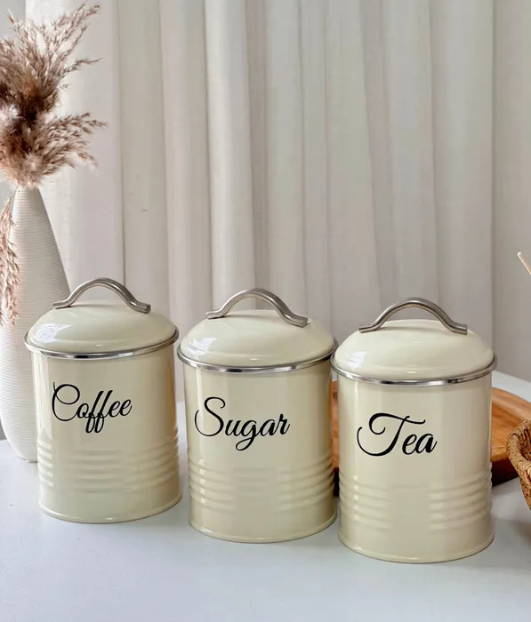 שלישיית קופסאות מעוצבות לשמירה על קפה, סוכר ותה בסגנון קלאסי.