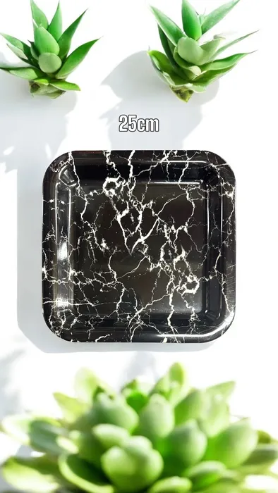 - תיאור מוצר: מגש פלסטיק מרובע בצבע שחור עם דוגמת שיש לבנה, בעיצוב אלגנטי ויוקרתי. עמיד ורב שימושי, מתאים להגשת מאכלים וקינוחים באירוח יוקרתי.