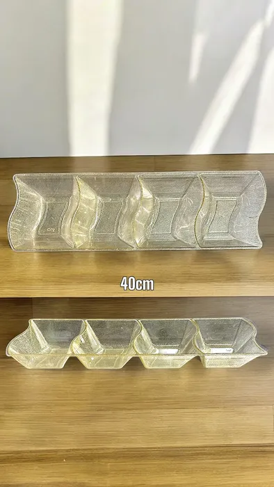 - תיאור מוצר: מגש פלסטיק רב שימושי בצבע נצנץ זהב, מחולק לארבעה תאים. עיצוב ייחודי ומרהיב המתאים להגשת פירות, קינוחים או כפריט דקורטיבי בכל אירוע.