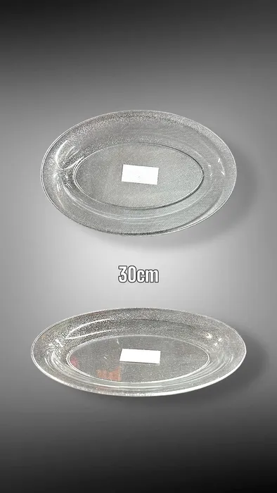 - תיאור מוצר: מגש פלסטיק אובלי עם גימור נצנץ כסף, מעניק מראה יוקרתי ומרשים. עמיד ורב שימושי, מתאים להגשת מנות חגיגיות, קינוחים או לשימוש דקורטיבי.