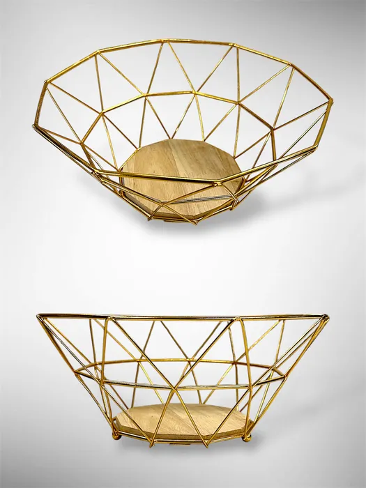 סלסלת מתכת בצבע זהב בעיצוב גיאומטרי ייחודי, עם תחתית עץ אלגנטית, מושלמת להגשת פירות או כפריט דקורטיבי לשולחן.